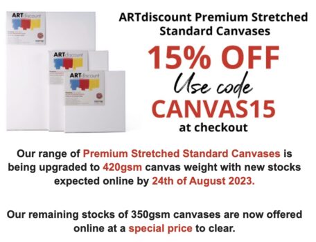 Our range of Premium Stretched Standard Canvases is being upgraded to 420gsm canvas weight with new stocks expected online by 24th of August 2023. Our remaining stocks of 350gsm canvases are now offered online at a special price to clear. Code CANVAS15 is valid only on ARTdiscount Premium Stretched Standard Canvases 350gsm (Multi-Packs) Whilst stocks last
