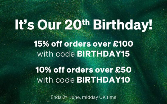 To celebrate their 20th birthday, they’re offering exclusive savings! Get 10% off orders over £50 with code BIRTHDAY10, or 15% off when you spend over £100 using code BIRTHDAY15. Offer ends at midday on 2nd June (UK time) – don’t miss out!
