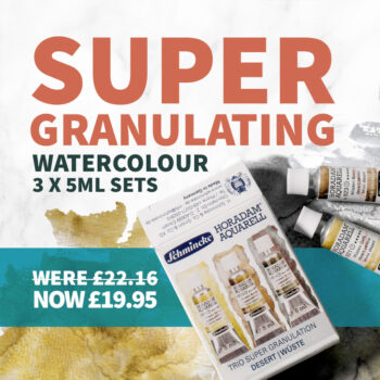 Experience texture like never before with our Schmincke Super Granulation Sets – NOW ONLY £19.95! Split into 9 themed groups, Super Granulating colours make use of naturally granulating pigments to create colours that give enhanced textural effects. Watch as these pigments split and settle into the surface of your paper to create mottled textures perfect for capturing moody landscapes, atmospheric seascapes, dramatic abstracts and more!